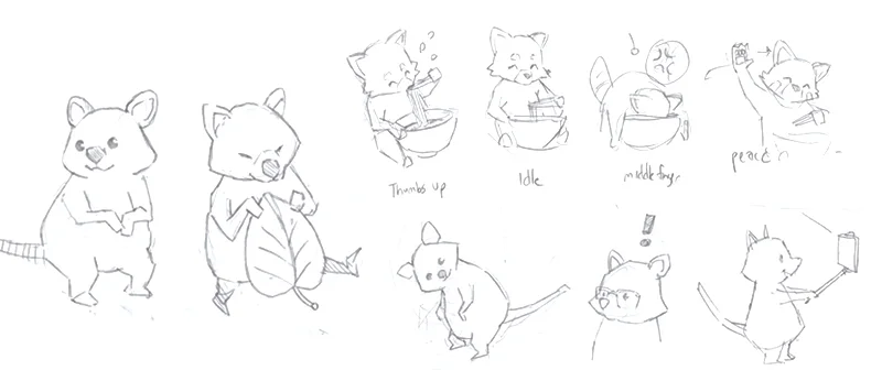 Sketching out various animal poses including a Quokka, which didn’t make it in the final version :(